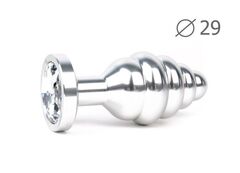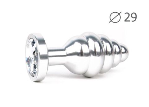 Коническая ребристая серебристая анальная втулка с прозрачным кристаллом - 7,1 см.