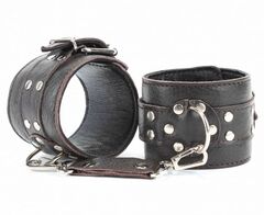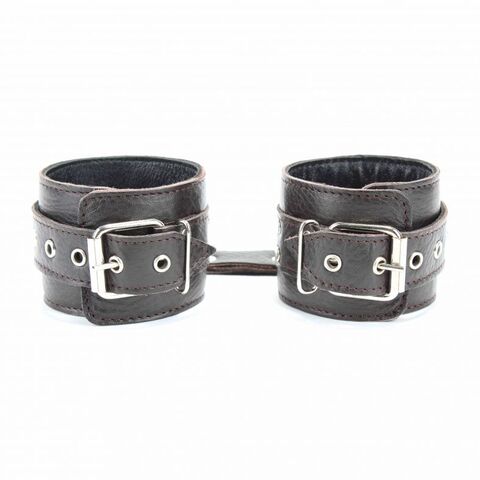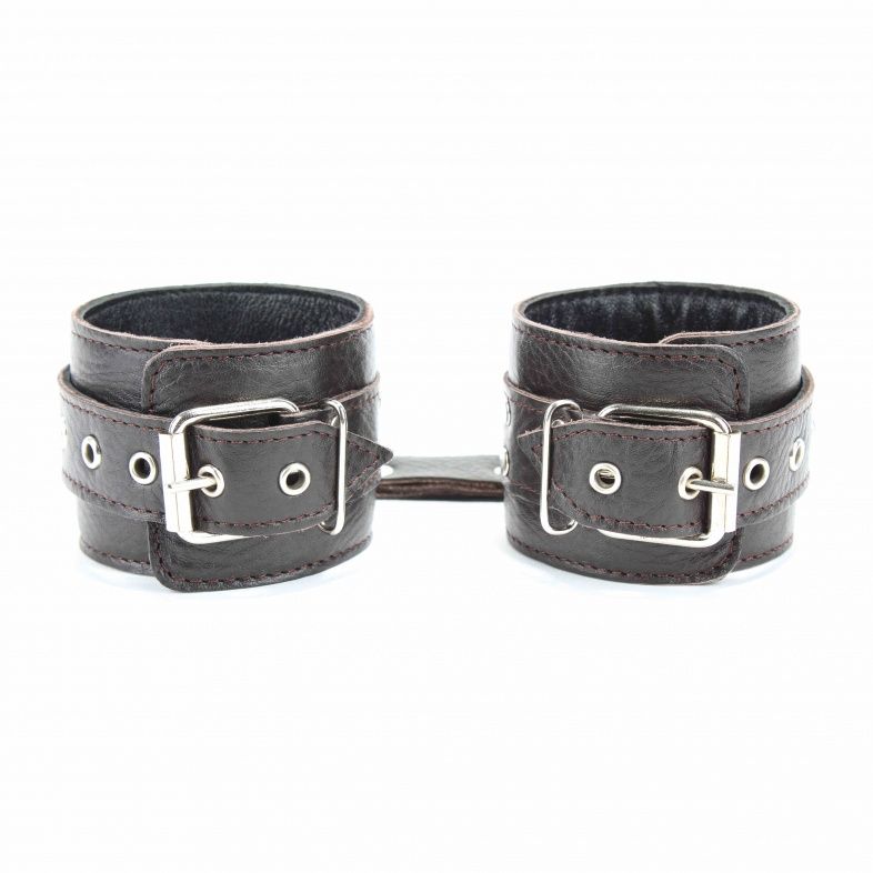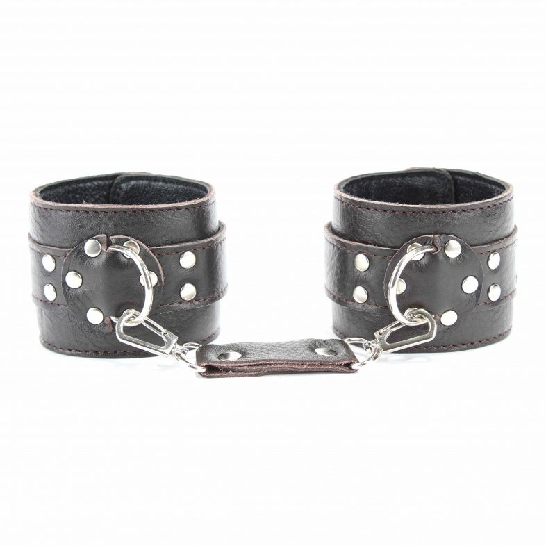 Наручники выполнены из натуральной мягкой кожи темно-коричневого цвета. Изделие декорировано заклепками. По середине расположено полукольцо из сварной фурнитуры. Наручники надежно фиксируются пряжками и ремнями, позволяющими выбрать нужный размер, подойдут на обхват руки от 16 до 24 см. Кожаное соединение на карабинах фиксирует наручники вместе. Приятные для тела и стильные наручники отлично подходят для воплощения эротических БДСМ игр. Ширина - 6 см.