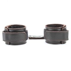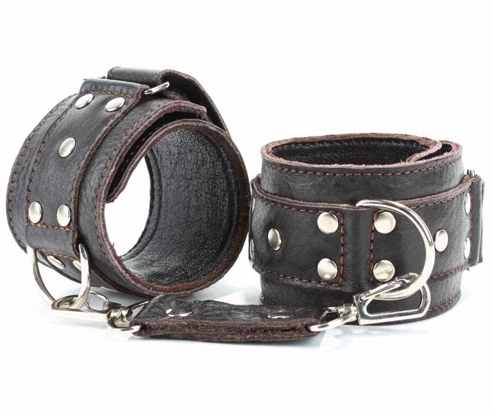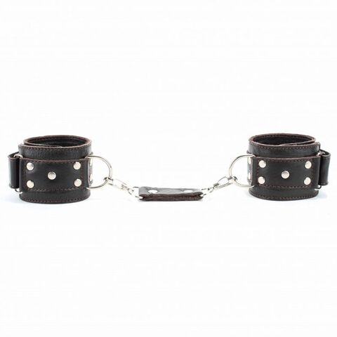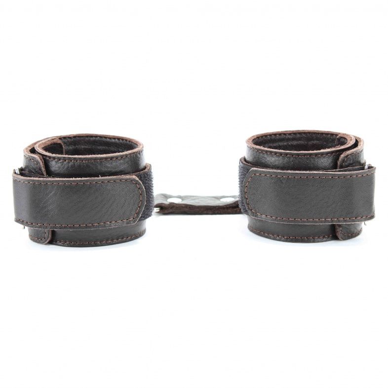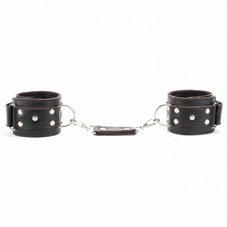 Оковы выполнены из натуральной мягкой коричневой кожи, легко, но надежно фиксируются ремнями на липучке, позволяя выбрать нужный размер, подойдут на обхват от 19 до 25 см. Аксессуар декорирован заклепками. Кожаное соединение на карабинах фиксирует наножники вместе. Мягкий подклад из натуральной кожи обеспечит комфортное пребывание в образе, помогая полностью погрузиться в БДСМ игру. Ширина - 5 см.