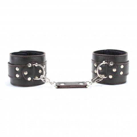 Оковы выполнены из натуральной мягкой кожи темно-коричневого цвета. Изделие декорировано металлическими заклепками. По середине расположено полукольцо из сварной фурнитуры. Оковы надежно фиксируются пряжками и ремнями, позволяющими выбрать нужный размер, подойдут на обхват от 16 до 27 см. Кожаное соединение на карабинах фиксирует оковы вместе. Приятные для тела и стильные наножники отлично подходят для воплощения эротических БДСМ фантазий. Ширина - 6 см.