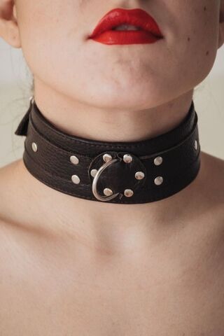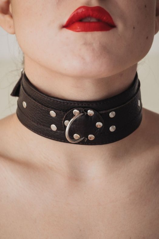 Ошейник выполнен из качественной натуральной коричневой кожи, мягкий и комфортный в использовании. Впереди находится сварное полукольцо. Аксессуар декорирован металлическими заклепками, фиксируется ремнем сзади, удобно регулируется длина, подойдет на обхват от 30 до 38 см. Стильный аксессуар поможет воплотить эротические фантазии в реальность. Ширина - 5 см.