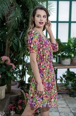 Женская туника выполнена из эластичной принтованной сетки. Модель приталенного силуэта длиной выше колена. По талии и по плечам изделия кулиска на резинке. Рукав короткий.