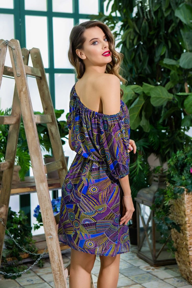 Женская туника выполнена из эластичной принтованной сетки. Модель приталенного силуэта длиной выше колена. По талии и по плечам изделия кулиска на резинке. Рукав короткий.