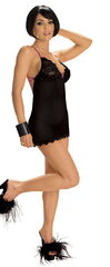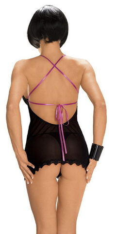 Облегающая полупрозрачная сорочка. На груди ажурная ткань. На спине - элегантная шнуровка из атласной ленты. Прозрачные стринги в комплекте. В комплекте: сорочка, трусики-стринг.