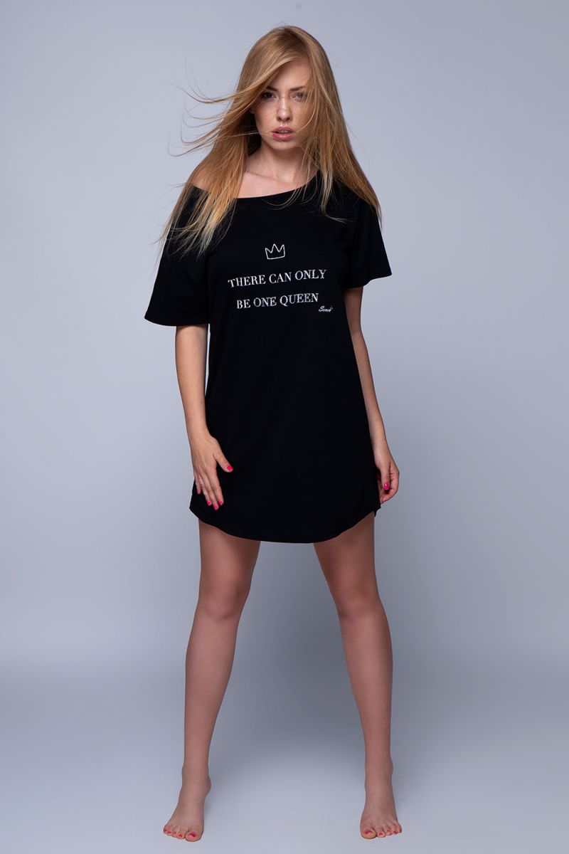 Молодежная сорочка для сна и отдыха Celeste свободного кроя, с коротким спущенным рукавом и круглым вырезом горловины. Изделие с принтом в виде надписи на груди.