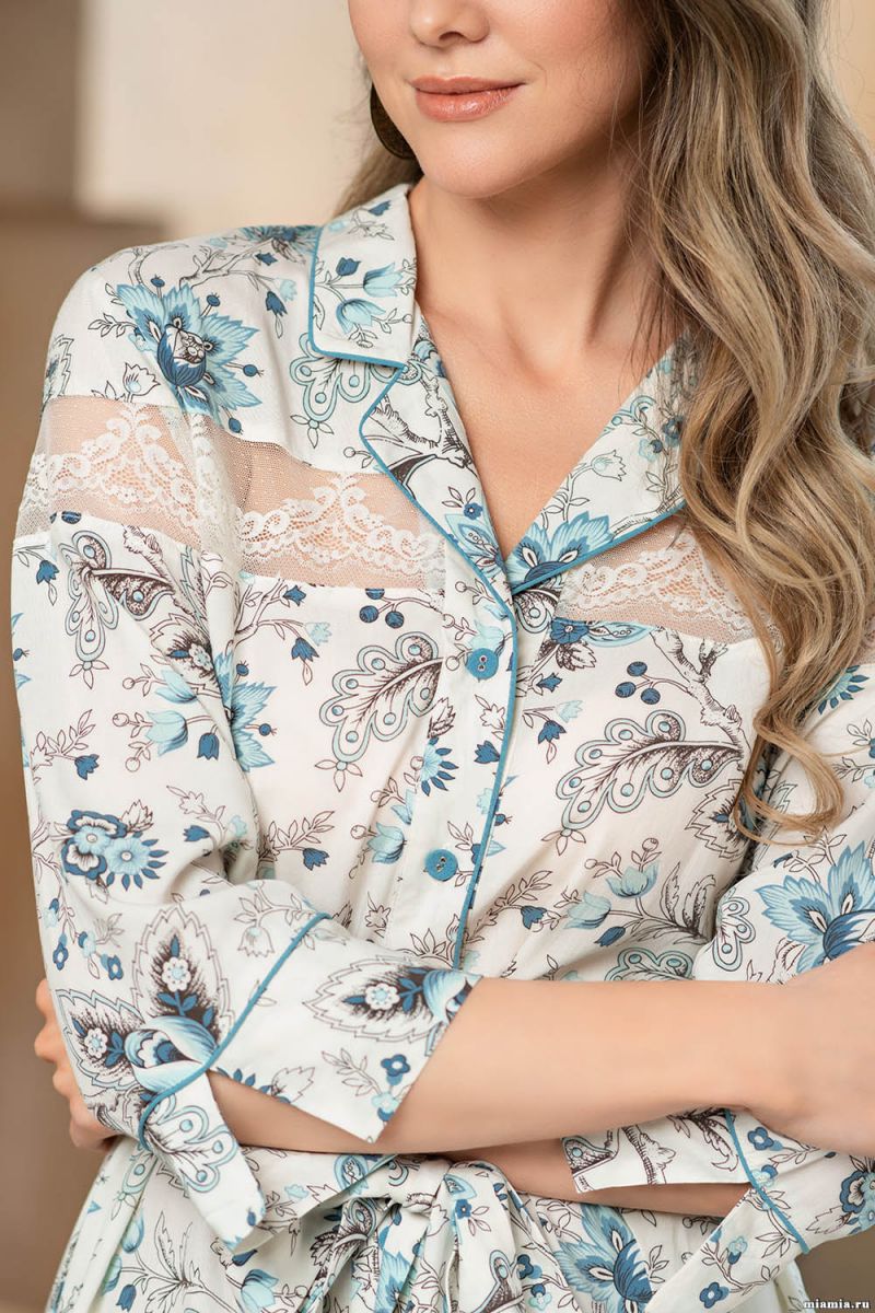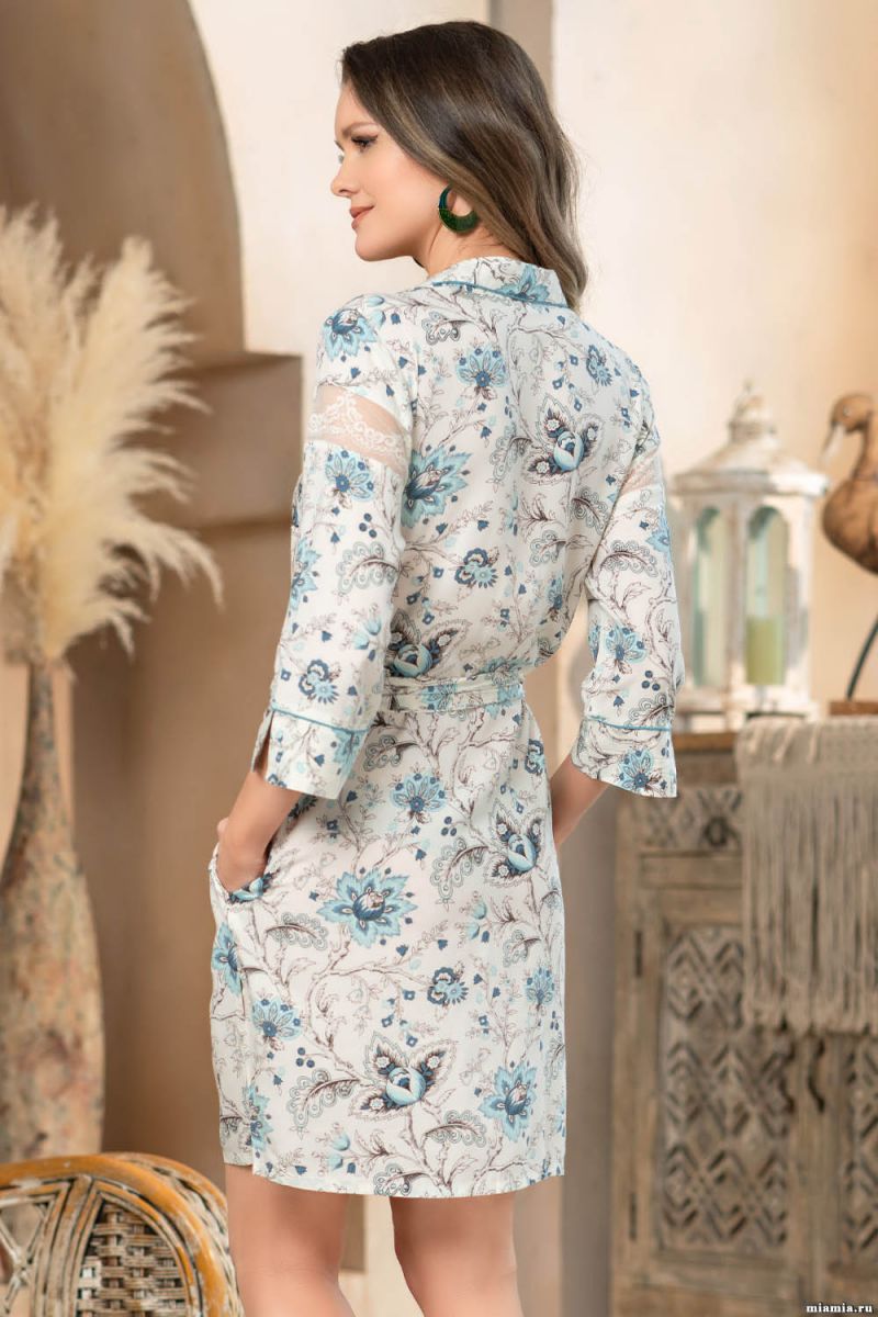 Короткий халат на пуговицах с рукавом длиной 3/4, выполнен из принтованной вискозы. По воротнику и линии борта халата проходит контрастный кант. В боковых швах обработаны карманы, а по низу - разрезы. Кружевные вставки украшают верх изделия.