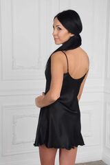 Короткая шелковистая сорочка на тонких регулируемых бретелях, выполнена из искусственного шелка, декорирована тонким ажурным кружевом в тон.