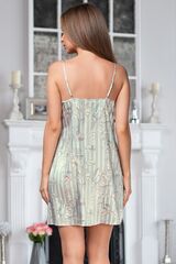 Короткая сорочка на тонких бретелях с отрезным чашками, выполнена из искусственного принтованного шелка. Края чашек обработаны двухцветными обтачками. Декор - маленький атласный бантик с подвеской по центру выреза.