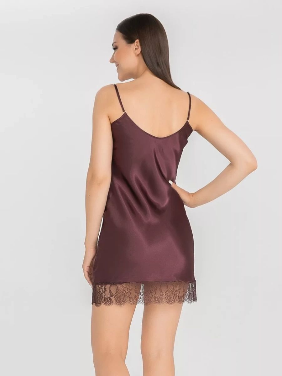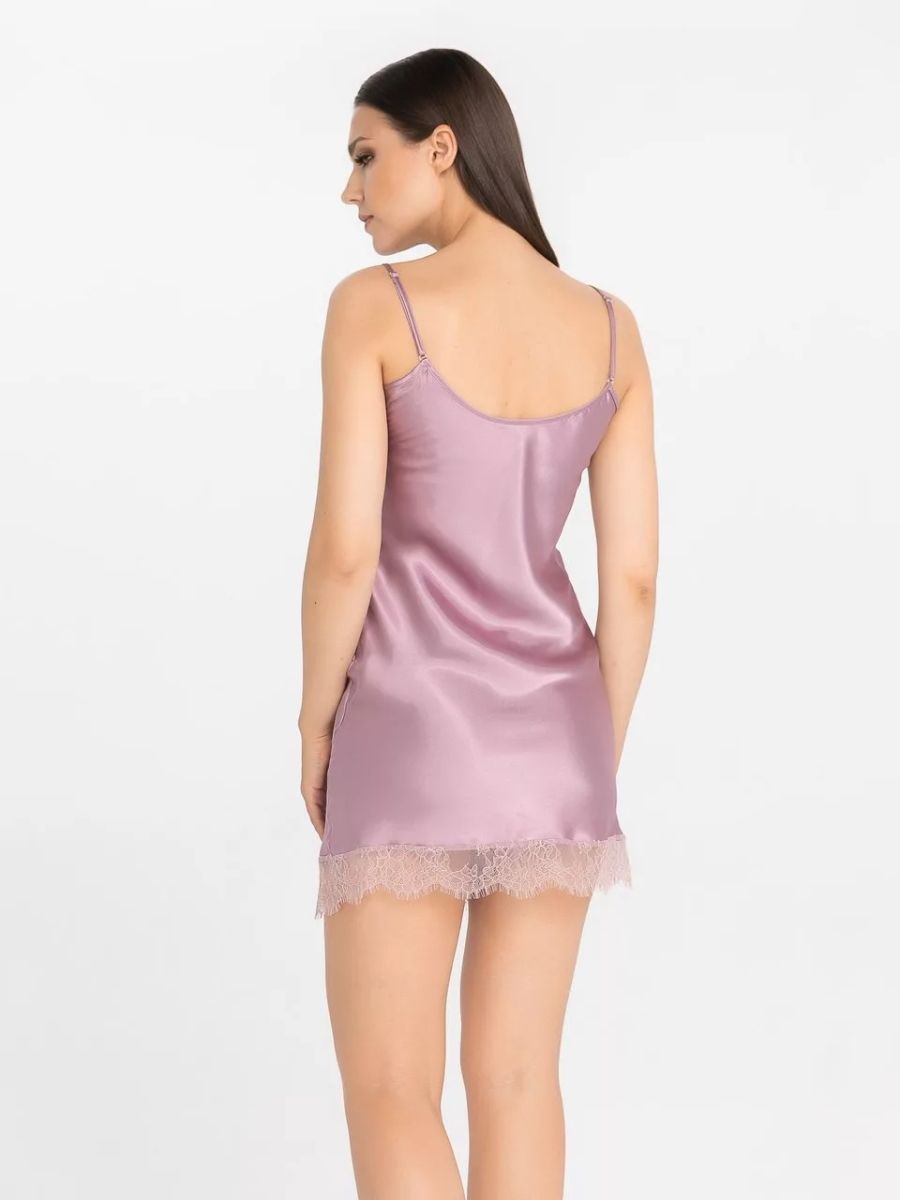 Короткая сорочка на узких бретелях из искусственного шелка, декорирована кружевом по подолу и линии декольте.