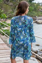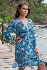 Короткая туника Felina с длинным рукавом выполнена из трикотажной мелкой принтованной сетки. Рукава туники украшены тесьмой. По центру горловина декорирована завязками с кисточками.