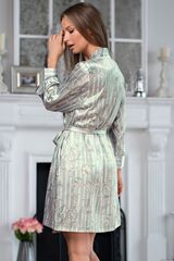 Короткий халат–кимоно с рукавом 3/4, выполнен из искусственного принтованного шелка с отделкой тканью компаньоном по бортам и низу рукавов. По бокам расположены карманы.