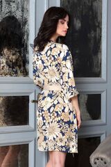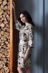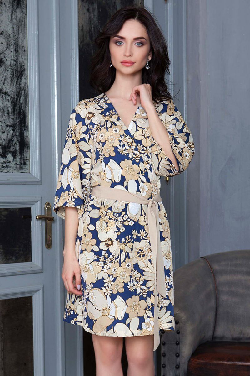 Короткий халат прямого силуэта, из принтованного тонкого крепа. Модель с втачными рукавами 3/4. Халат завязывается на пояс из однотонного крепа и на внутреннюю завязку. В боковых швах модели карманы.