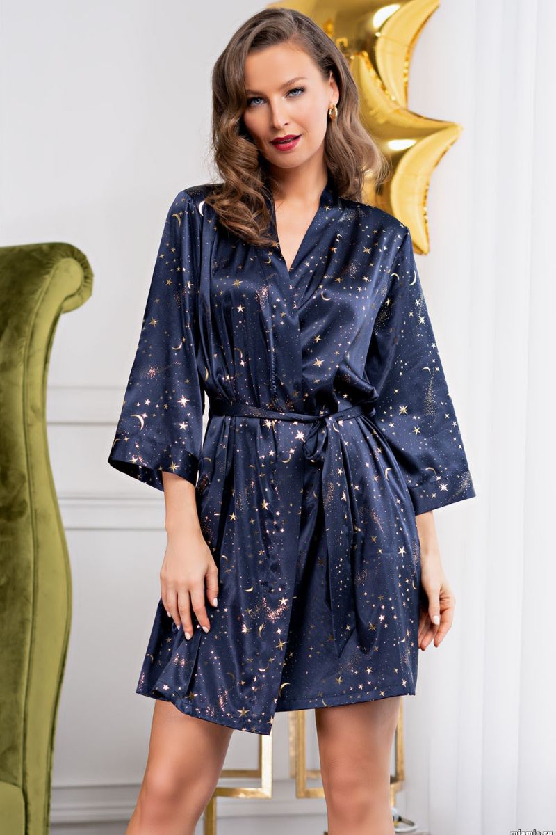 Короткий халат с рукавами 3/4 выполнен из атласного полотна, принтованного золотыми звездочками. Запах халата фиксируется поясом, в боковых швах есть карманы.