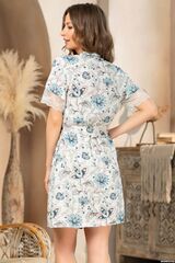 Запашной халат с коротким рукавом, выполнен из принтованной вискозы. Низ рукавов обработан кружевом. Линия борта подчеркнута за счет контрастного канта. В боковых швах расположены карманы.