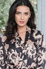 Короткий халат Versachi Gold с длинным рукавом выполнен из принтованного искусственного шелка. По низу рукава халата декорированы тонким кремовым кружевом.