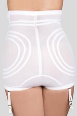 Корсетные трусы с завышенной талией сильной степени коррекции с эксклюзивной кружевной вставкой на животе и особым кроем из круговых швов, обеспечивающих уникальную коррекцию бедер и талии. Есть скрытые 4 крепежа для подвязок для чулок. Вшитая молния и крючки обеспечивают легкость надевания и комфорт при носке.