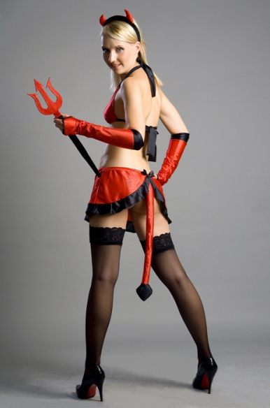 Костюм дьяволицы состоит из рожек на ободке, красных перчаток через палец, красного лифа, который удобно завязывается на шее и спине и юбочки с длинным хвостиком.
