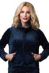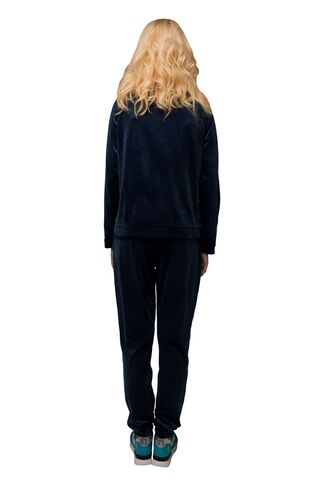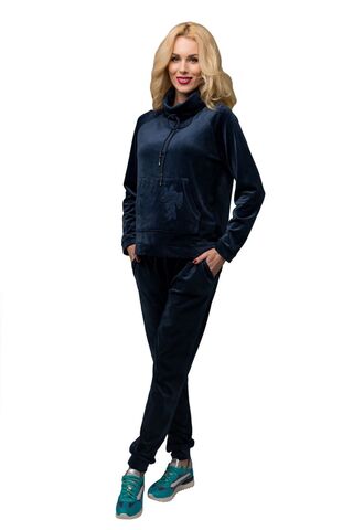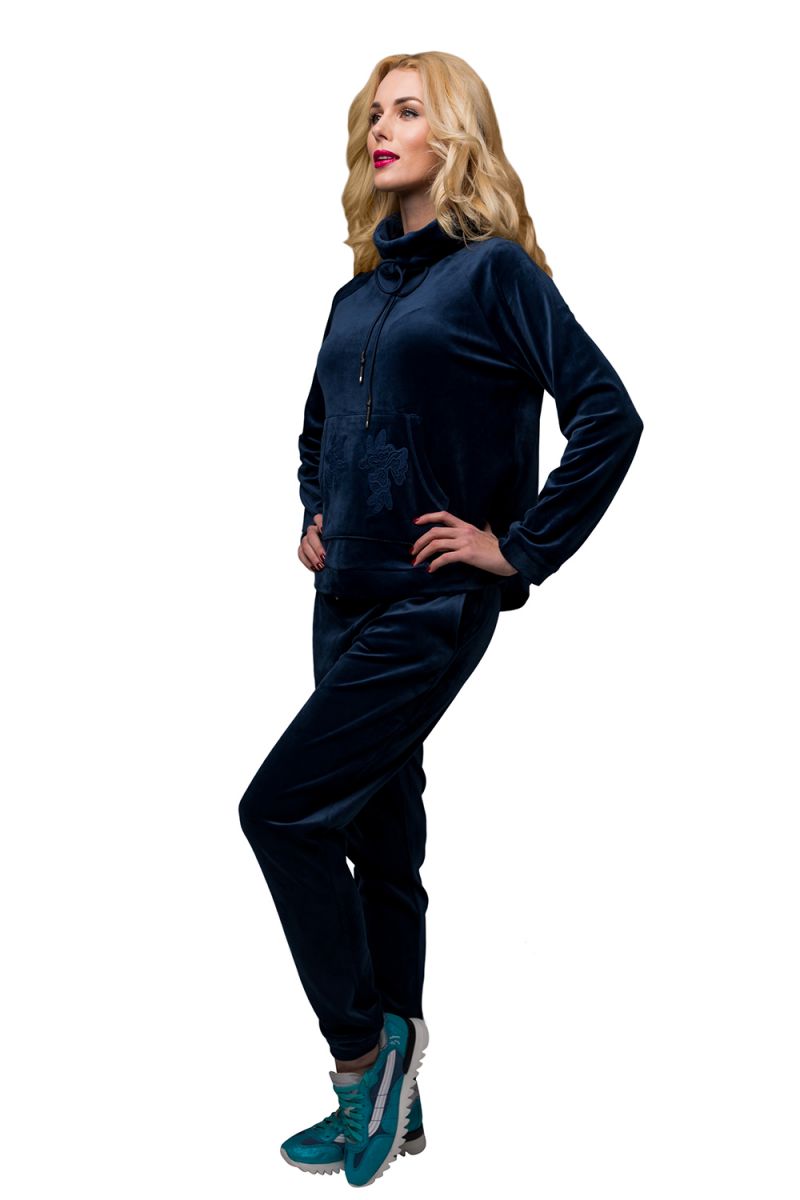 Изысканный женский костюм свободного кроя из мягкого бархатного материала. Топ с длинными рукавами реглан, в воротник – хомут продета кулиска, позволяющая его моделировать. Накладной карман-кенгуру декорирован кружевными цветами. Брюки – свободные, на манжетах, с удобными карманами. Костюм подходит для дома и активного отдыха. В комплекте: топ и брюки.