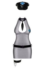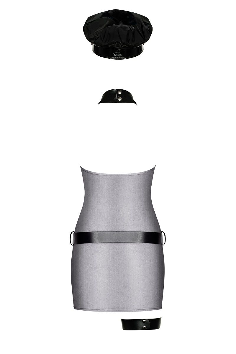 Костюм полицейского. В комплект входит: облегающее платье, трусики, ремень, подвязка на ногу и фуражка. В комплект: платье, трусики-стринги, ремень, подвязка, фуражка.