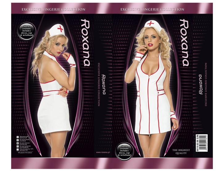 Верхняя часть спины открыта, открытые плечи. Круглый вырез, выгодно подчеркивающий зону декольте. Основной цвет: белый, присутствуют элементы декора красного цвета. В комплекте: платье, головной убор, манжеты.