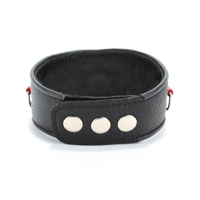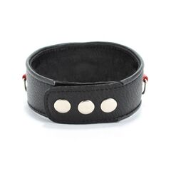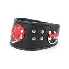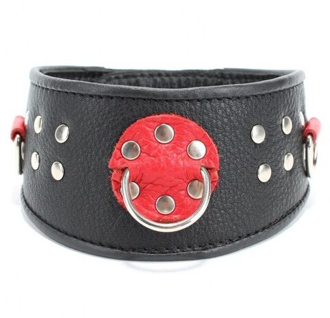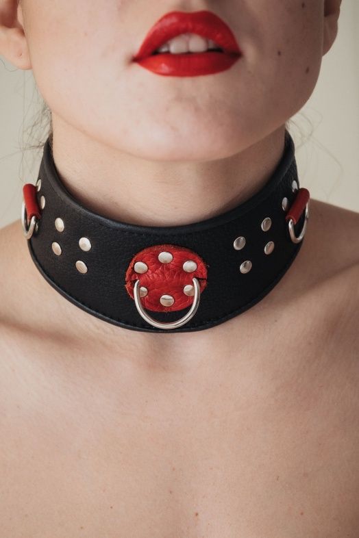 Ошейник с расширением впереди выполнен из качественной натуральной черной кожи, мягкий и комфортный в использовании. На изделии находятся три сварных полукольца. Аксессуар декорирован металлическими заклепками, вставками из красной кожи. Ошейник фиксируется металлическими кнопками, позволяющими подобрать нужный размер, подойдет на обхват шеи от 30 до 36 см. Стильный аксессуар поможет воплотить эротические фантазии в реальность. Ширина - 6 см.