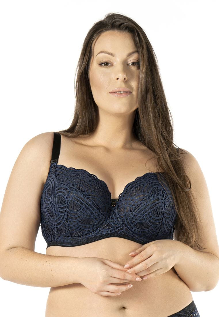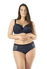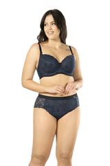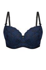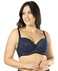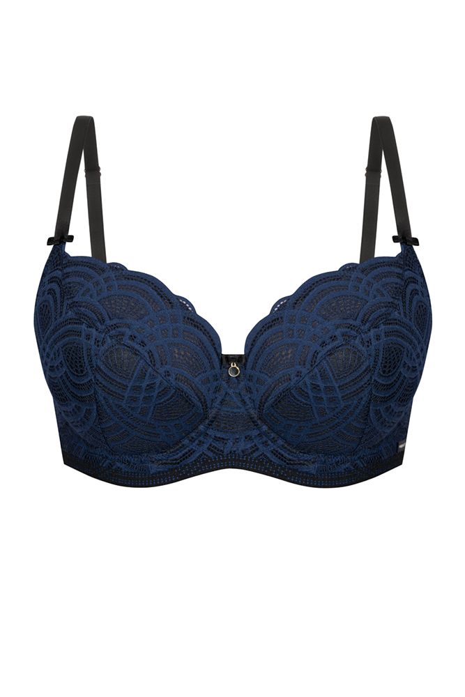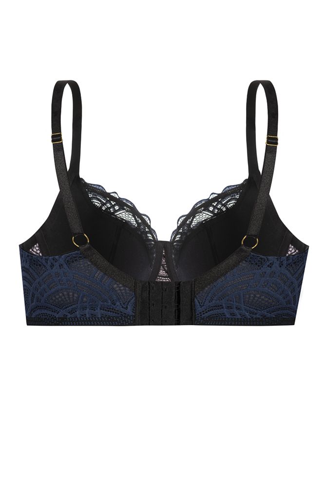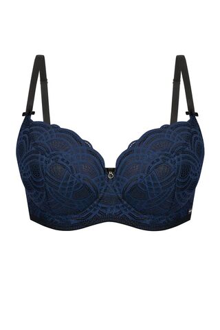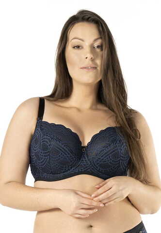 Бюстгальтер Debora PU выполнен на косточках, с дополнительными боковыми поддержками, чашки шитые, нижняя часть чашки на тонком поролоне черного цвета, внутренняя сторона проложена хлопковым трикотажем, внешняя и верхняя часть чашки из кружева темно-синего цвета, спинка кружевная, продублирована черной сеткой. Бретельки пришиты, регулируются по длине. На спине застёжка на удлинитель, фурнитура металлическая цвета желтого золота.