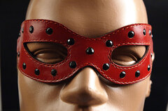 Лаковая красная кожа, прорези для глаз, черные стразы по контуру, застежка красный ремешок с пряжкой.