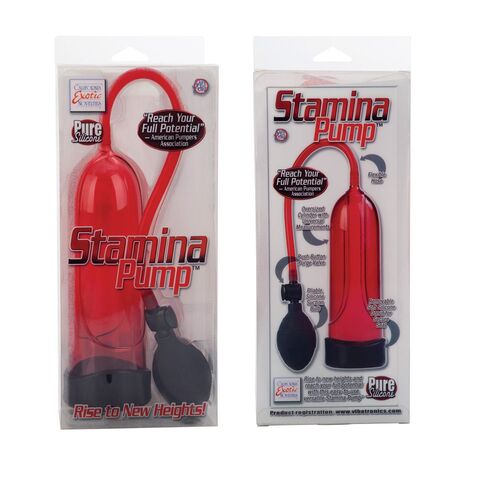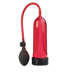 Вакуумная помпа для настоящих мужских тренировок. Пластиковая колба красного цвета с определенным рельефом, чтобы было удобно держать ее в руке. Груша для нагнетания воздуха, шланг и насадка на колбу выполнены из силикона.