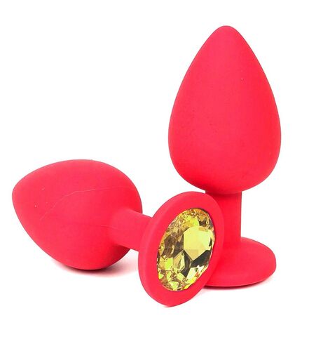 Красная силиконовая анальная пробка с желтым стразом - 9,2 см.