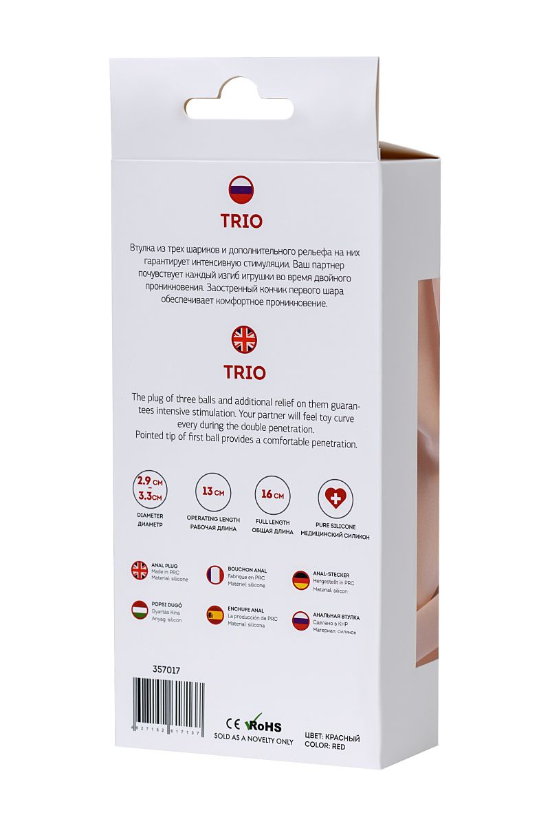 Втулка из трех шариков и дополнительного рельефа на них гарантирует интенсивную стимуляцию. Ваш партнер почувствует каждый изгиб игрушки во время двойного проникновения. Заостренный кончик первого шара обеспечивает комфортное проникновение. Рабочая длина - 13 см.