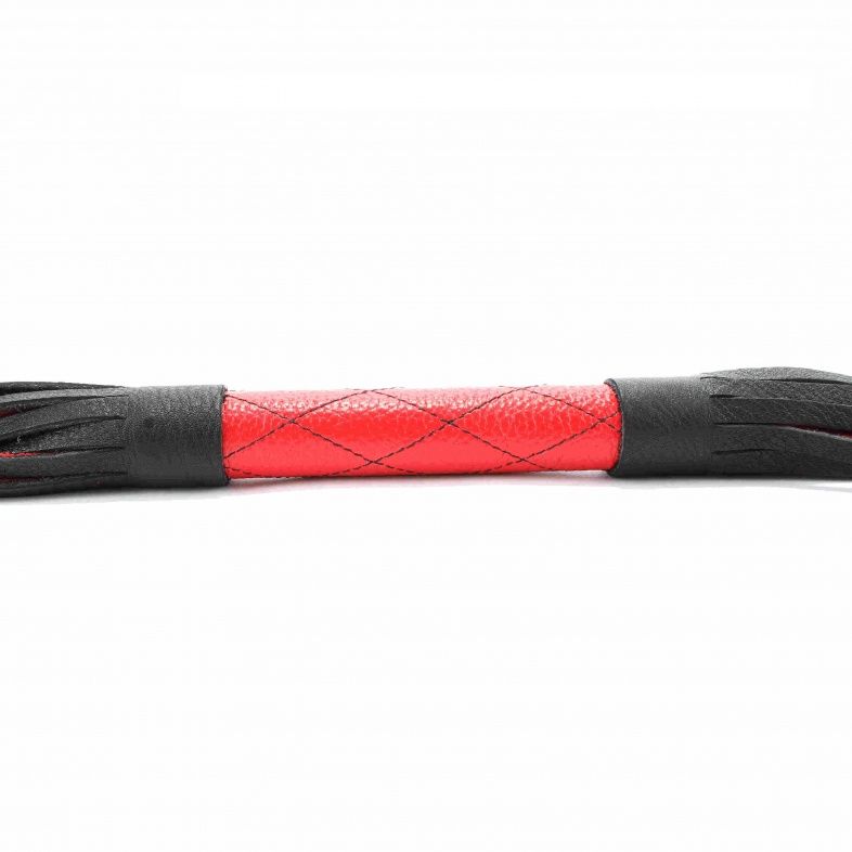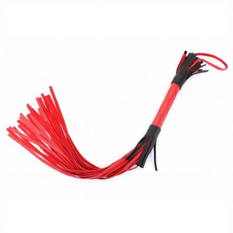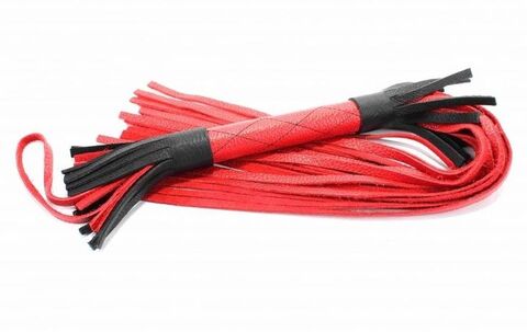 Плеть выполнена из натуральной кожи красного цвета. Рукоятка декорирована прострочкой черными нитками в форме ромба, вставками из черной кожи. Для удобства в верхней части рукоятки расположена петелька. Хвосты плети мягкие. Количество хвостов - 20 штук. Плеть позволит партнерам воплотить самые сокровенные желания. Длина рукояти - 16 см.