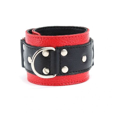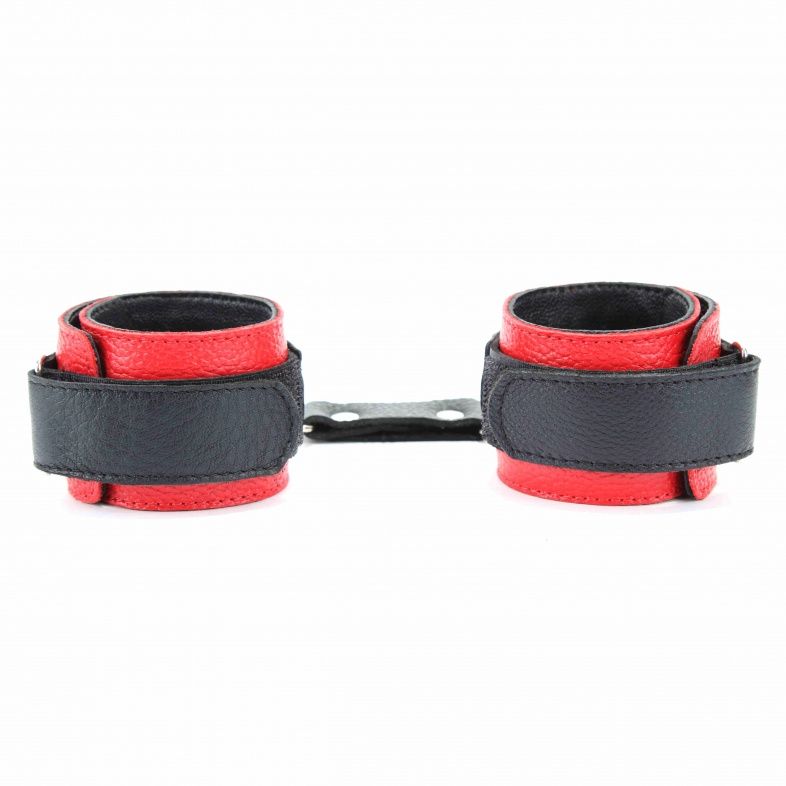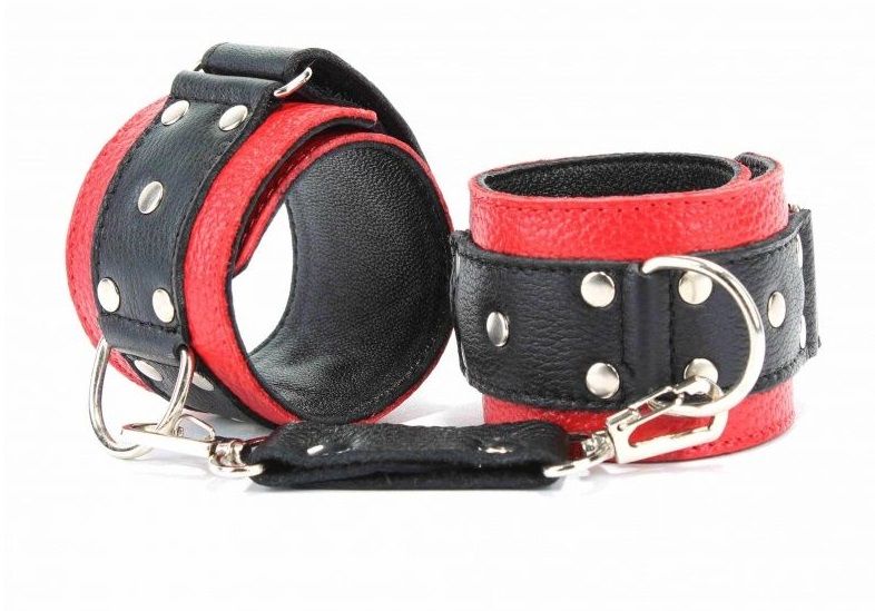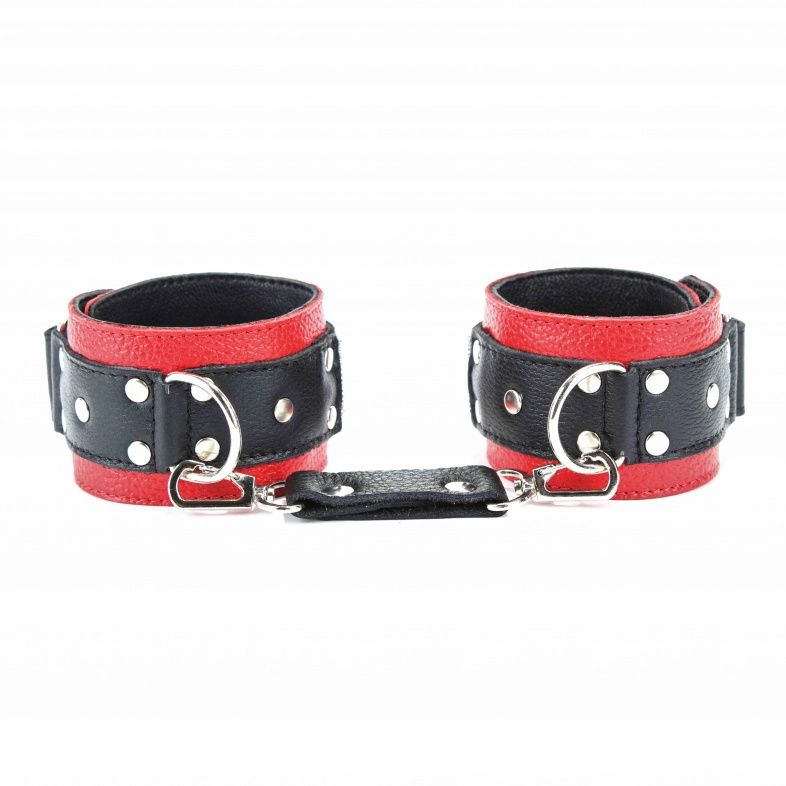 Кожаные наручники в красно-черной гамме. Украшены заклепками и соединяются между собой цепью с карабинами. Размер наручников регулируется при помощи застежки-липучки. Подойдут на обхват руки от 15 до 20 см. Ширина - 5 см.