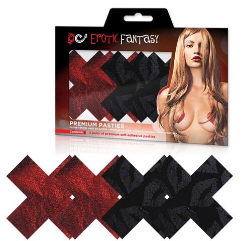 Больше никаких неудобств и неудобного белья, когда одеваешь сексуальные платья и топы, например, на романтическое свидание! Добавьте сексуальности своему имиджу! Новые соблазнительные платья и топы без бретелей, красивое декольте - все может быть в Вашем новом стиле, и Вы можете не бояться, что будет открыто слишком много! Две пары пэстисов в форме крестов - красные однотонные, покрытые красным сатином, и черные с принтом губ.