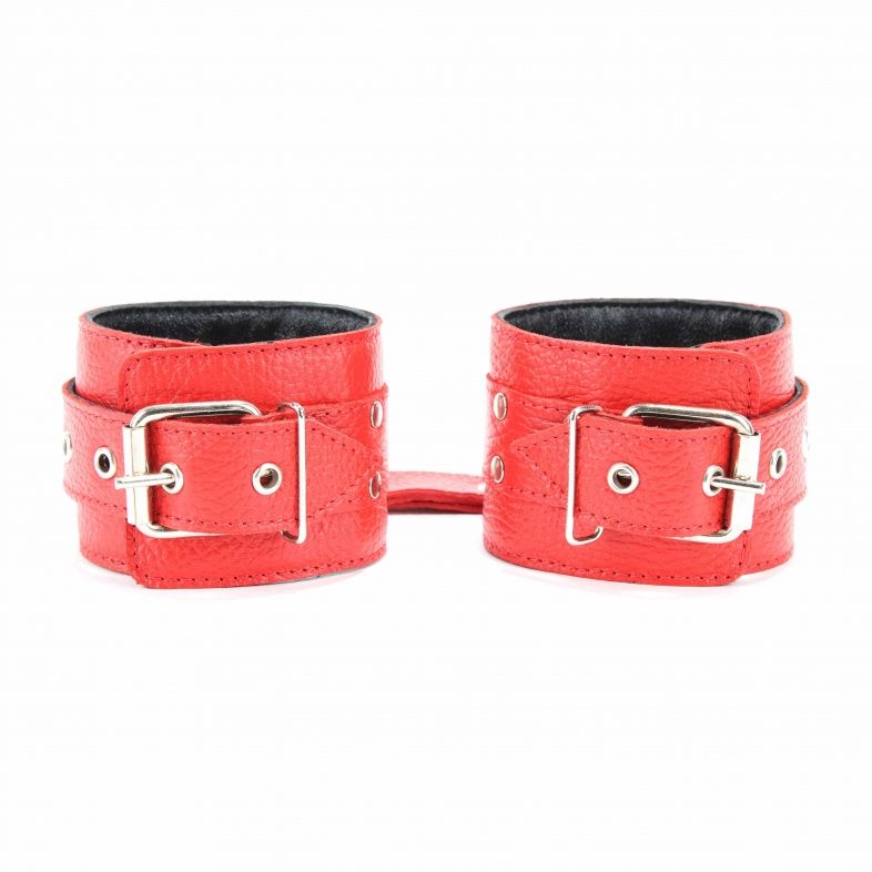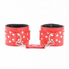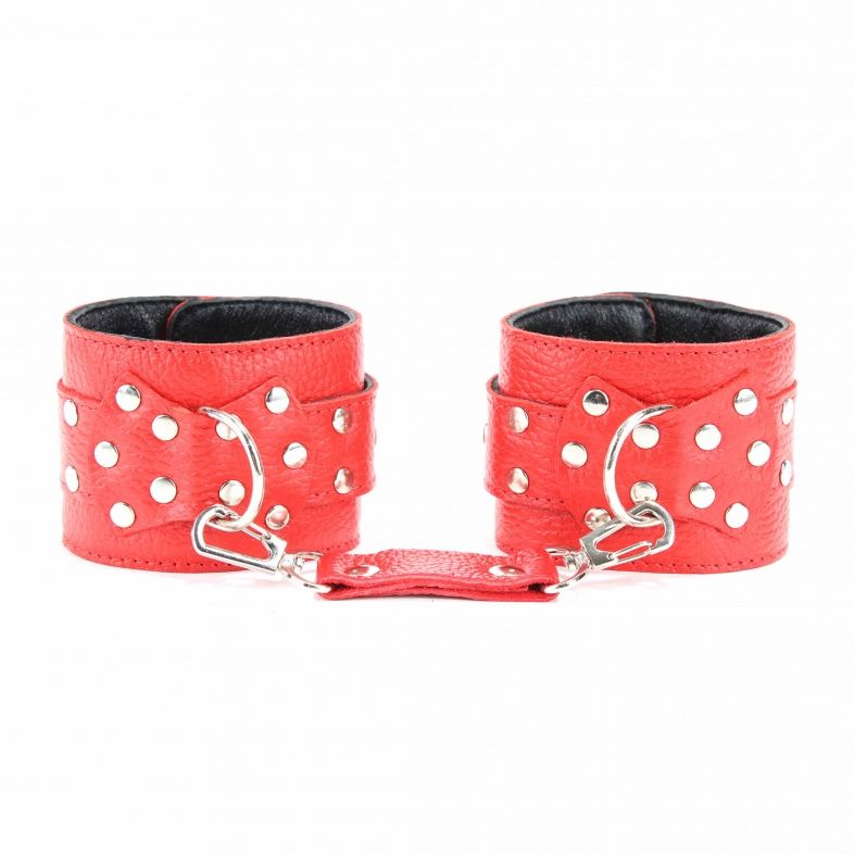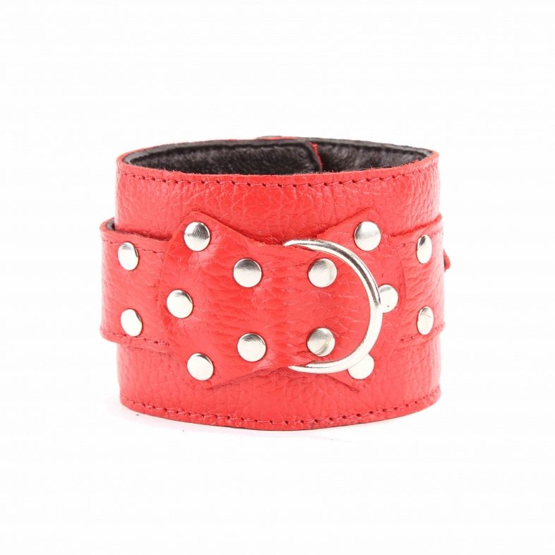 Наручники выполнены из натуральной кожи красного цвета. Декорированы заклепками и бантом с металлическим кольцом. Наручники надежно фиксируются пряжками и ремнями, позволяющими выбрать нужный размер, подойдут на обхват руки от 16 до 25 см. Нежный подклад из черной кожи обеспечивает комфорт, кожаное соединение на карабинах фиксирует наручники вместе. Аксессуар позволяет в полной мере насладиться сексом в стиле БДСМ. Ширина - 6 см.
