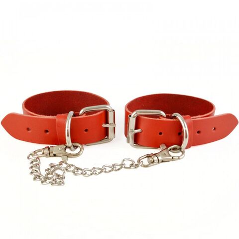 Оковы изготовлены из натуральной кожи алого цвета. Регулируются пряжкой, имею цепочку с карабинами.