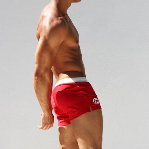 Красные мужские плавки-хипсы с контрастным поясом.