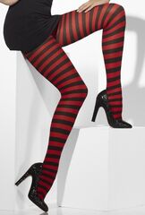 Красные непрозрачные колготы в черную полоску.