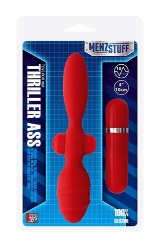 Красный двусторонний вибромассажер для анальной стимуляции MENZSTUFF THRILLER ASS. 10 режимов вибрации. Длина верхней гладкой части - 10 см.