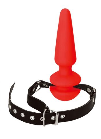 Кляп на ремне из искусственной кожи с силиконовым анальным плагом. Размер ремня регулируется, плаг надежно закреплен. Рабочая длина плага - 8,5 см, диаметр - 3 см.