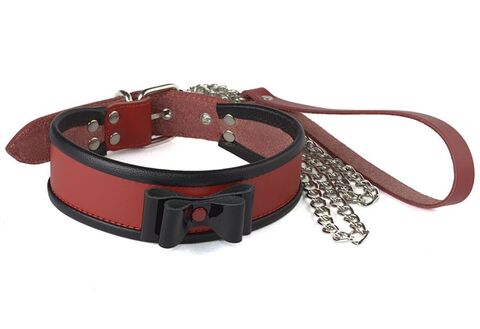 Ошейник из плотной натуральной высококачественной кожи красного цвета, украшенный контрастным черным лаковым объемным бантом. По краю ошейника проходит оторочка, обеспечивающая комфорт при ношении. На внешней части у застежки имеется D-образное колечко, за которое можно зацепить входящий в комплект поводок в виде металлической цепочки с фиксацией с помощью кожаной петли на запястье. Ширина - 3,6 см.