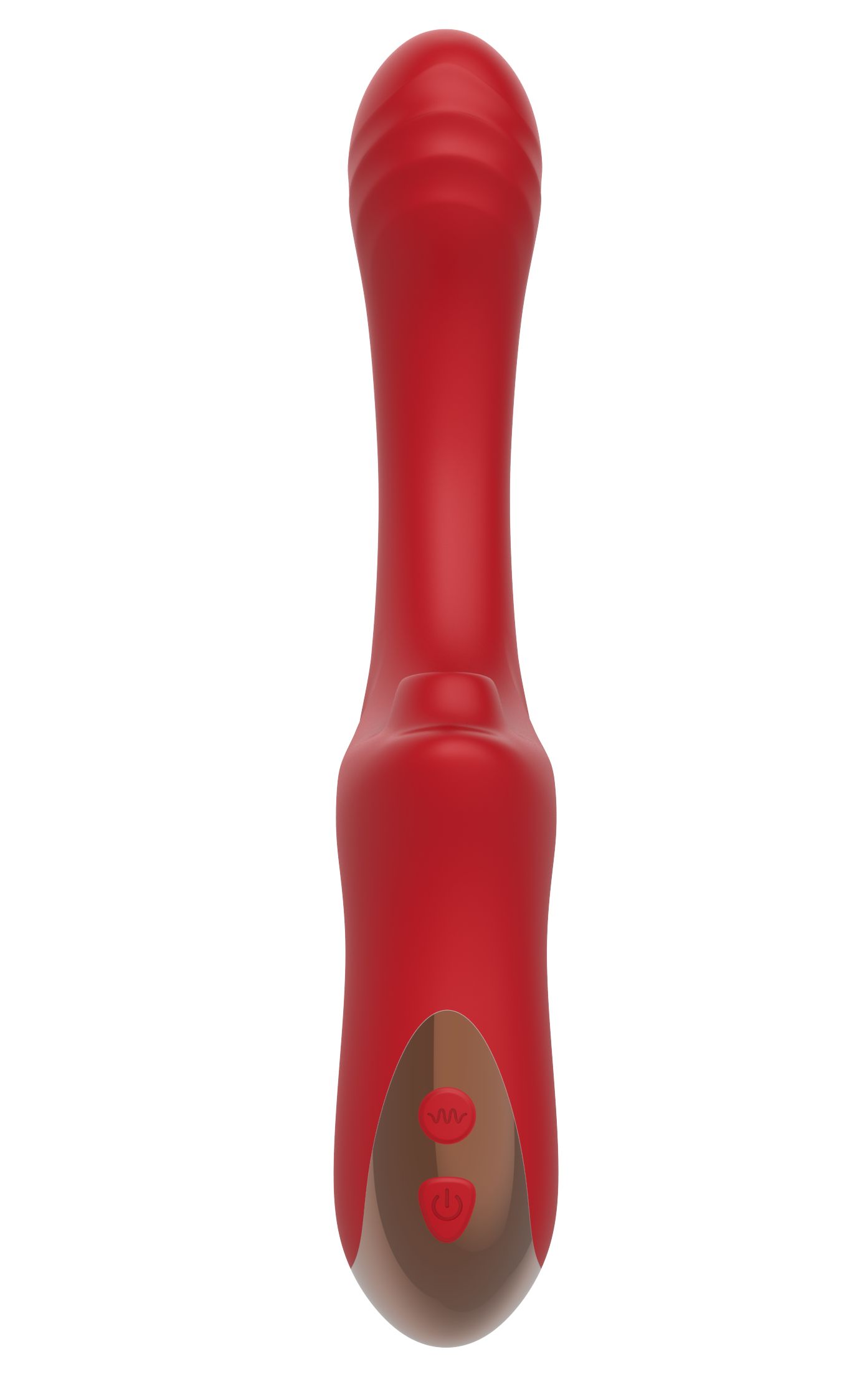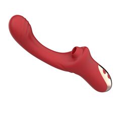 Красный вагинально-клиторальный вибратор. 10 режимов вибрации и 10 режимов посасывания в клиторальном отростке. Рабочая длина - 15,5 см.
