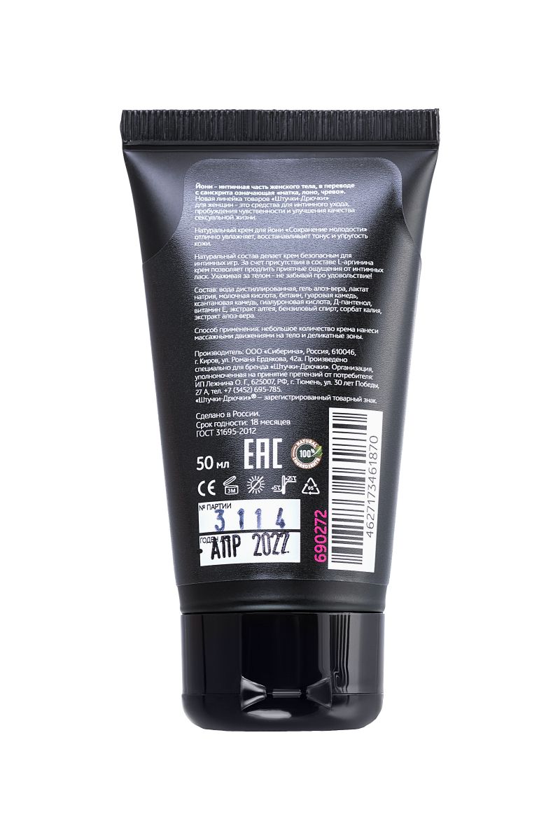 Натуральный крем для йони «Сохранение молодости» отлично увлажняет, восстанавливает тонус и упругость кожи. гель алоэ-вера увлажняет, успокаивает и заживляет. молочная кислота обеспечивает защитный барьер от патогенных микроорганизмов, нормализует ph-баланс. витамин е питает и увлажняет кожу. экстракты донника, моркови и хвоща возвращают коже упругость и тонус. Натуральный состав делает крем безопасным для интимных игр. За счет присутствия в составе L-аргинина крем позволяет продлить приятные ощущения от интимных ласк. Ухаживая за телом – не забывай про удовольствие!