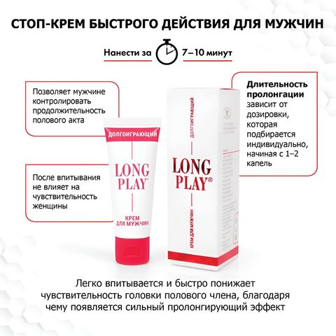 Мужской крем длительного действия для продления полового акта. Легкий, моментально впитывающийся крем, начинающий свое тормозящее действие уже спустя 7-10 минут с момента нанесения. Этот крем применяют мужчины, которые хотят быть сильными в любви и продлить время полового акта. Крем длительного действия дает мужчине возможность затянуть свое семяизвержение до появления женского любовного упоения.