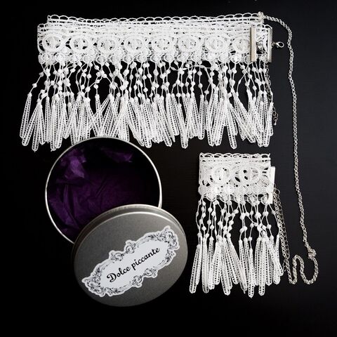 Восхитительно нежное и в то же время дерзкое белое колье с кружевными подвесками, обхватывающее женскую шейку, дальше тонкой цепочкой спускающееся вниз и опоясывающее талию. Подчеркнутая сексуальность. Бесподобное украшение для обнаженного тела. Французское кружево, филигранная ручная работа. Металлическая коробочка-шкатулка. Лимитированный тираж. Коллекция для спальни - Dolce Piccante. Размеры: