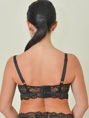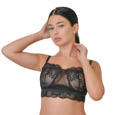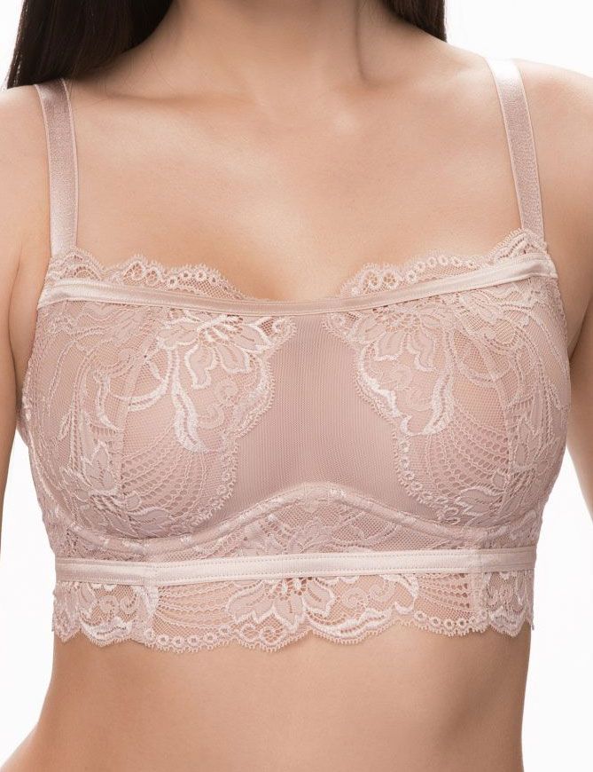 Кружевной бюстгальтер-бралетт с легкими чашками на каркасах, по центру декорирован эластичной сеткой. Благодаря вертикальным вытачкам на чашках грудь имеет поддержку снизу. Передняя часть стана укреплена неэластичным трикотажным полотном. По горловине и стану настрочена 12 мм эластичная лента на плоскошовной машине. Выполнен из объемного эластичного кружева с блеском.