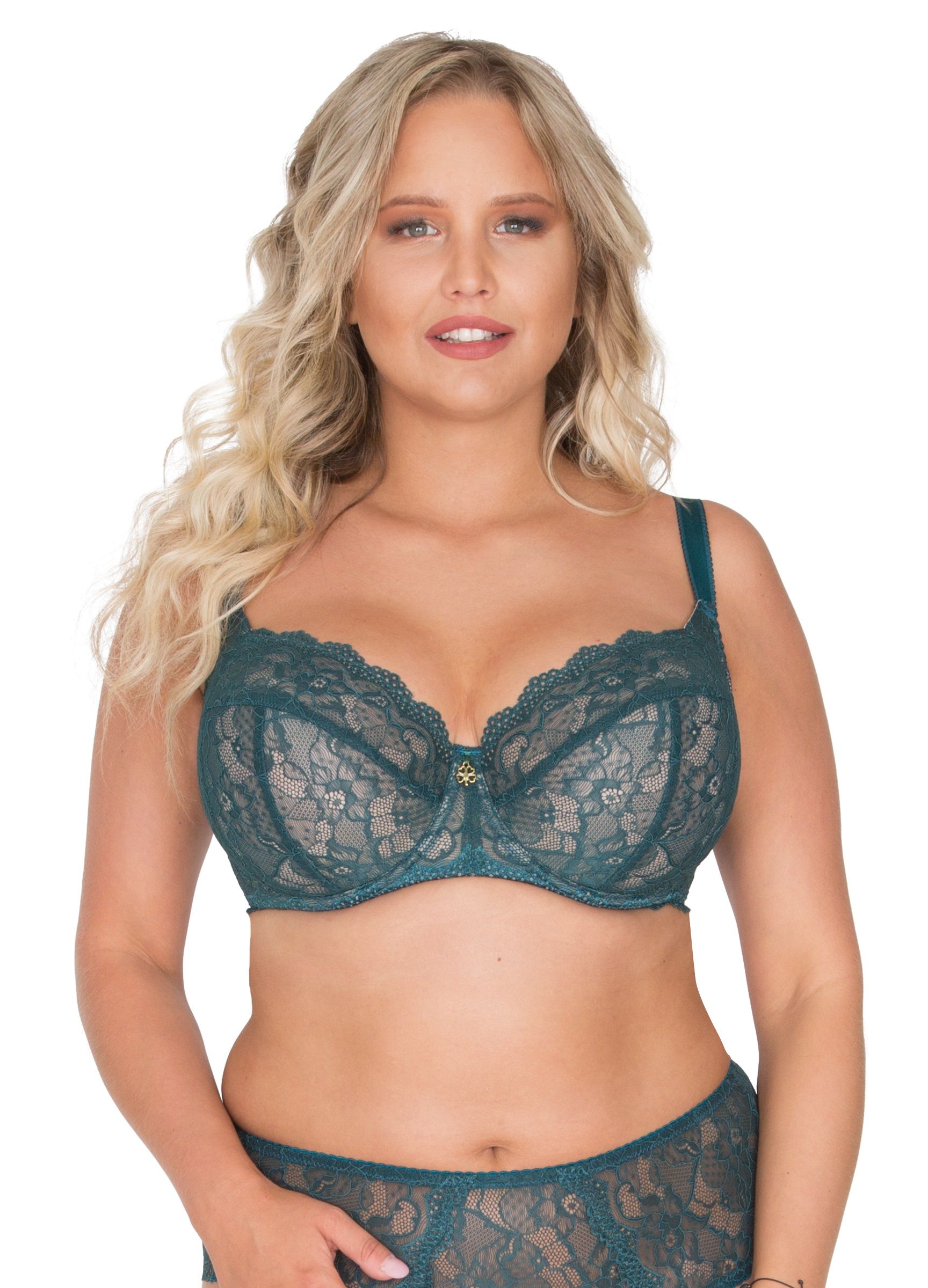 Бюстгальтер выполнен на косточках, с боковыми поддержками, чашки мягкие шитые из кружева цвета изумруд с Т-образным швом и боковым подкроем, чашки и спинка продублированы телесной сеткой. Бретельки пришиты, регулируются по длине, на спине застёжка - удлинитель на крючках, фурнитура металлическая крашеная.