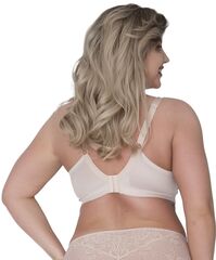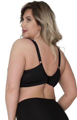 Бюстгальтер-топ выполнен с мягкими чашечками без косточек, чашки шитые из кружевного полотна, продублированы эластичной тканью в тон, под грудью пришита широкая эластичная резинка, спинка из стабилизирующей сетки, Бретельки регулируются по длине, не отстёгиваются, с подвижной фурнитурой-крючком для соединения бретелей на спине. На спине застёжка на удлинитель на 2 и 3 крюка. У данной модели довольно тугой пояс. Рекомендуем использовать удлинитель пояса бюстгальтера на первое время либо выбирать следующий за «своим» размер, с поясом длиннее.