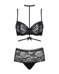 Комплект белья из серии Raquelia из кружева с цветочным орнаментом. Бюстгальтер мягкий, на косточках, тонкие бретельки регулируются по длине, на спине застежка. В комплект к бюстгальтеру идут высокие кружевные трусики-шорты и колье с застежками на шее и спине. В комплекте: бюстгальтер, трусики.