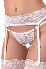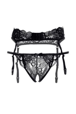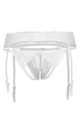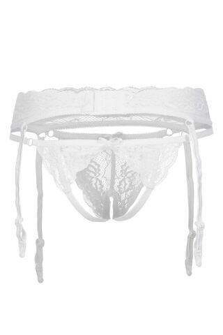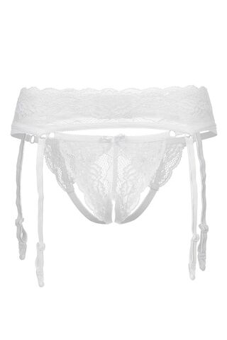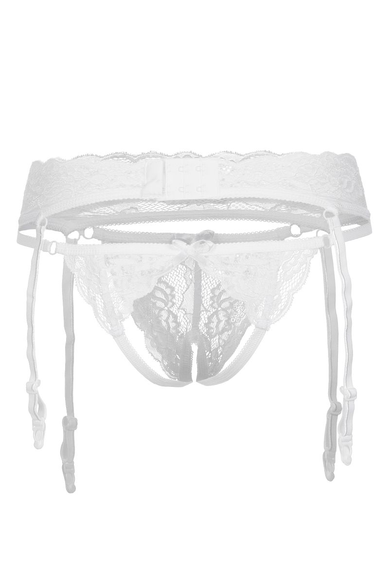 Эротический комплект из пояса для чулок и кружевных эластичных трусиков. Трусики с атласными бантиками. Пояс с ажурным верхним краем, на регулируемой застежке. В комплекте: пояс, трусики с открытой попкой.