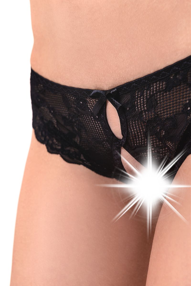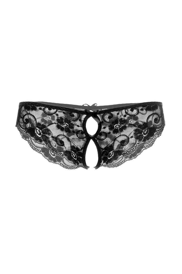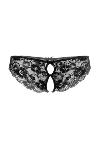 Эти оригинальные трусики даже не нужно снимать, если вас обоих всецело охватит страсть. Откровенный разрез, начинающийся от зоны бикини и заканчивающийся где-то над ложбинкой попки, откроет любимому доступ ко всем вашим прелестям.